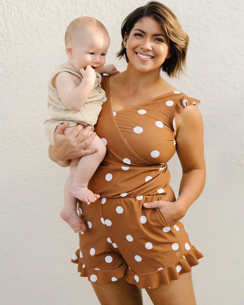 - With crossed v-neck, ruffle shoulder and hem design, nursing-friendly for moms and create a flattering look in style, ruffled sleeves and shorts come for a sophisticated take on a tropical-inspired look.