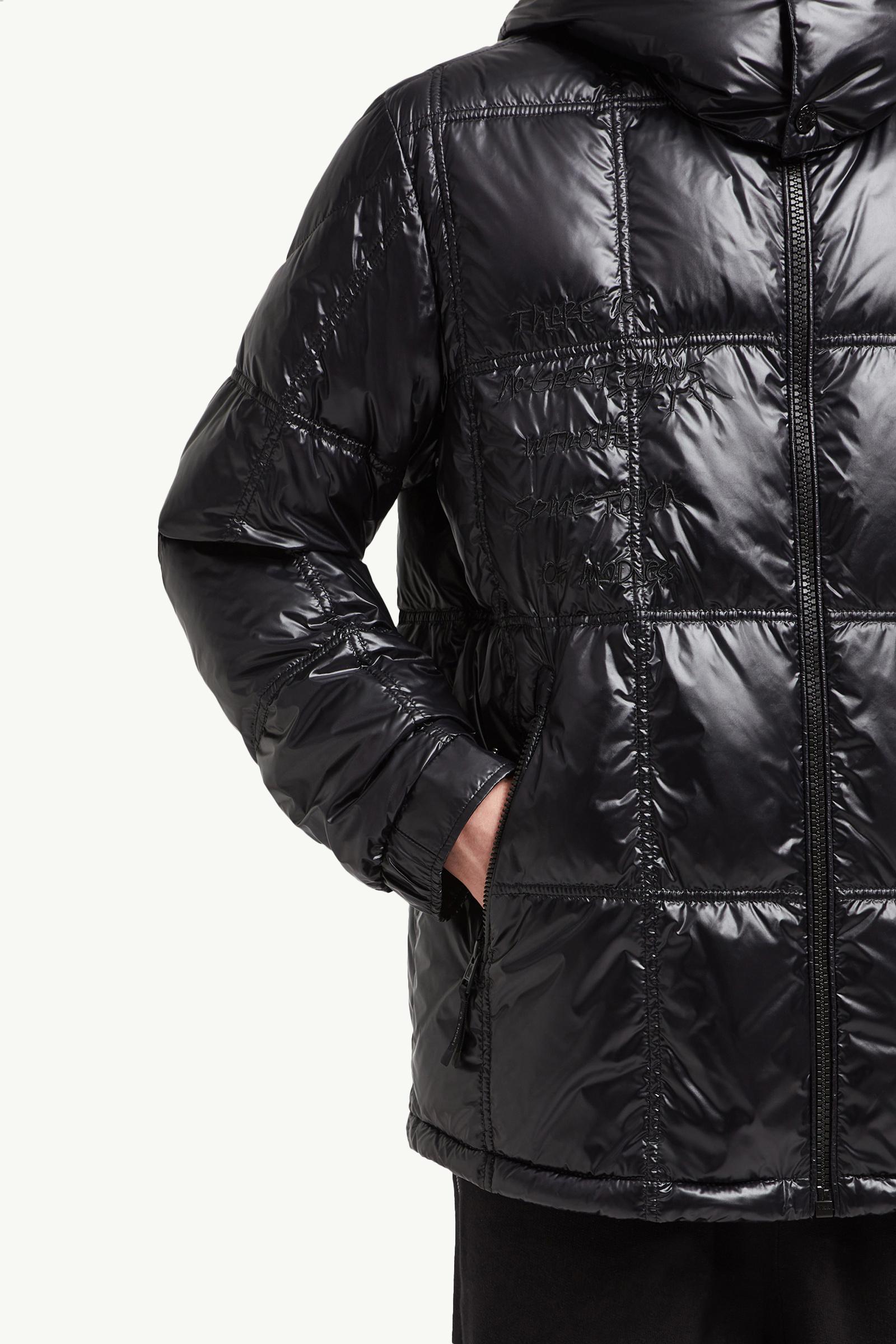 Classic MC codes are revisited in the Chaka short down jacket. Ideal for mild weather, the MC x FRGMT co-creation delivers a 50% lighter interpretation of the iconic Maya2 puffer. Practical for rainy weather, the nylon warmer boasts a water-repellent finish and detachable hood. An unexpected twist, the piece is embroidered with quotes from Nietzsche and Aristotle.