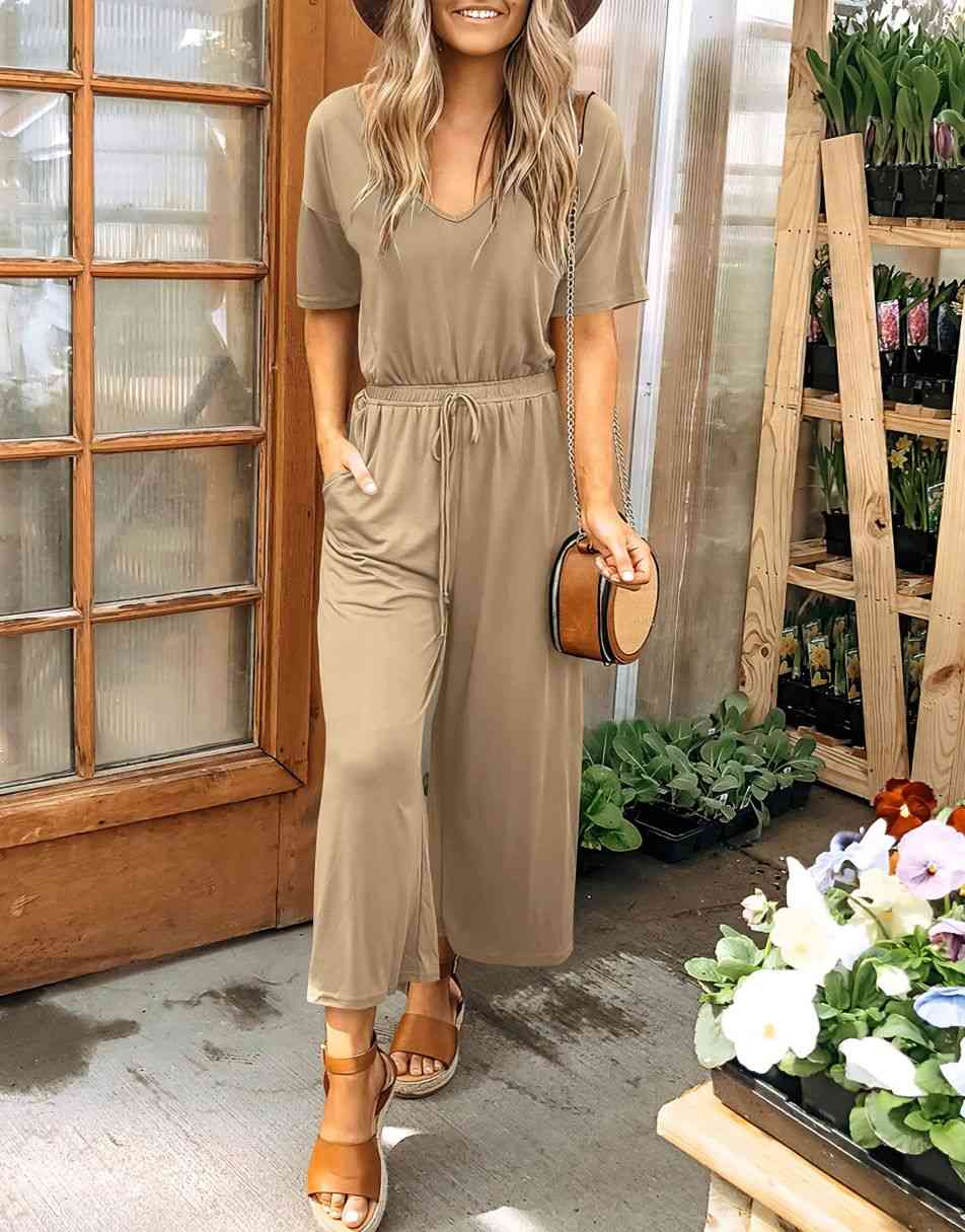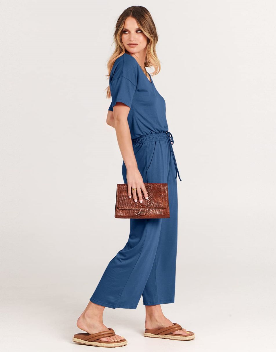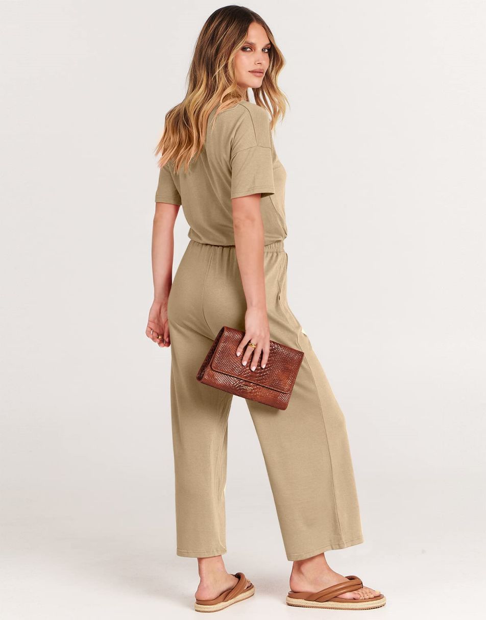 ANRABESS Short Sleeve V Neck Elastic Waist Wide Leg Cropped Pant Jumpsuits Rompers