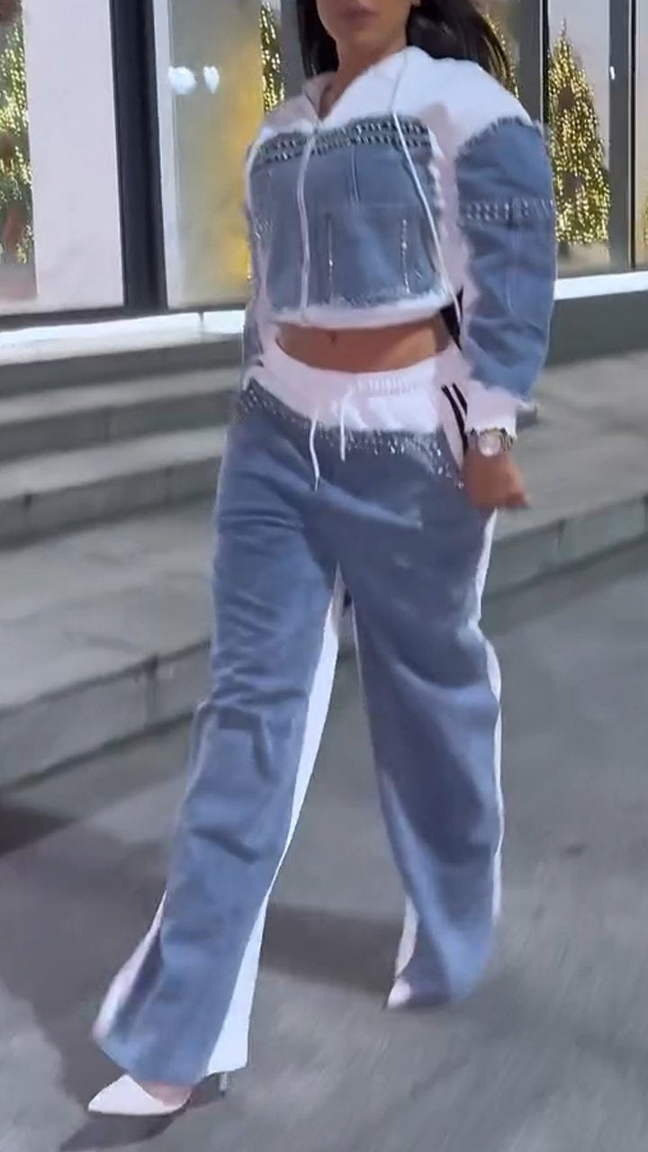 Women's Denim Patchwork Rhinestone Casual Suit